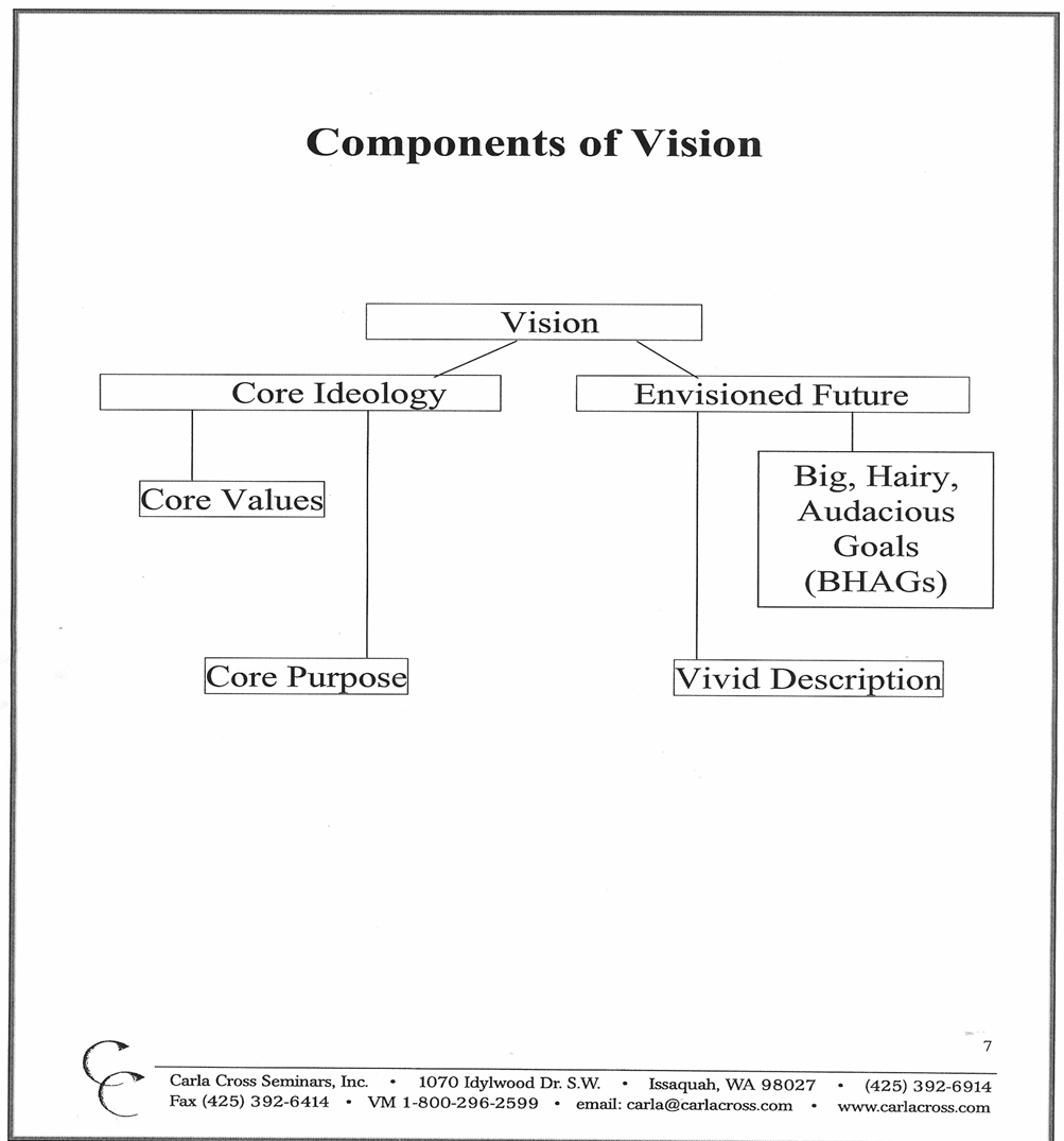 Your envisioned future is made from a vivid description of this future, and BHAGs—big hairy, audacious goals. Those are goals five years out, that you really don’t think you can attain.